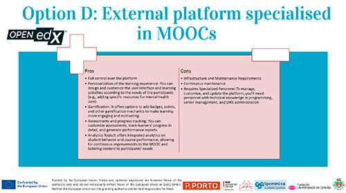 • Comprehensive report outlining specific platform requirements and design specifications, along with documentation detailing the proposed platform architecture, functionalities, and technical specifications; a clear road map and guidelines. It is decided to install a platform based on OpenEdx and hosted at the Universidade da Coruña.